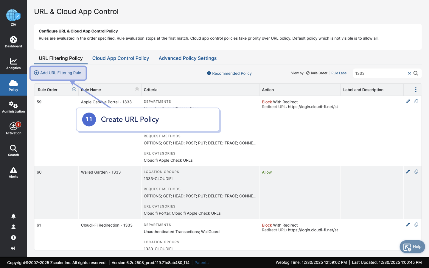 Navigate to Policy -> URL & Cloud APP Control and click "Add URL Filtering Rule".