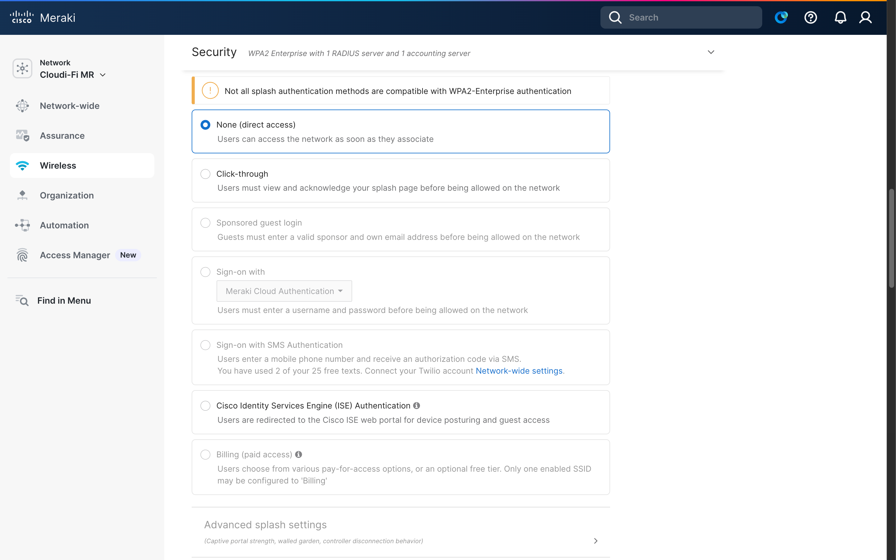 - Select the Meraki network you want to enable 802.1X