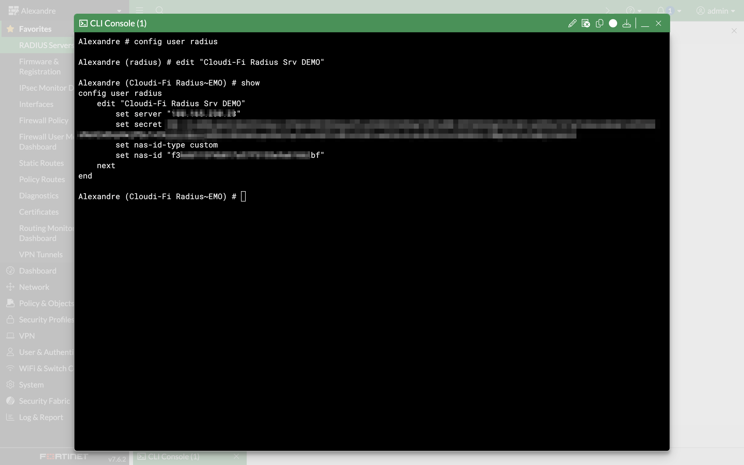 Then, in the FortiGate interface, navigate to FortiGate Administration > User & Authentication > RADIUS Servers and edit your Cloudi-Fi RADIUS server via CLI. Execute the following command: